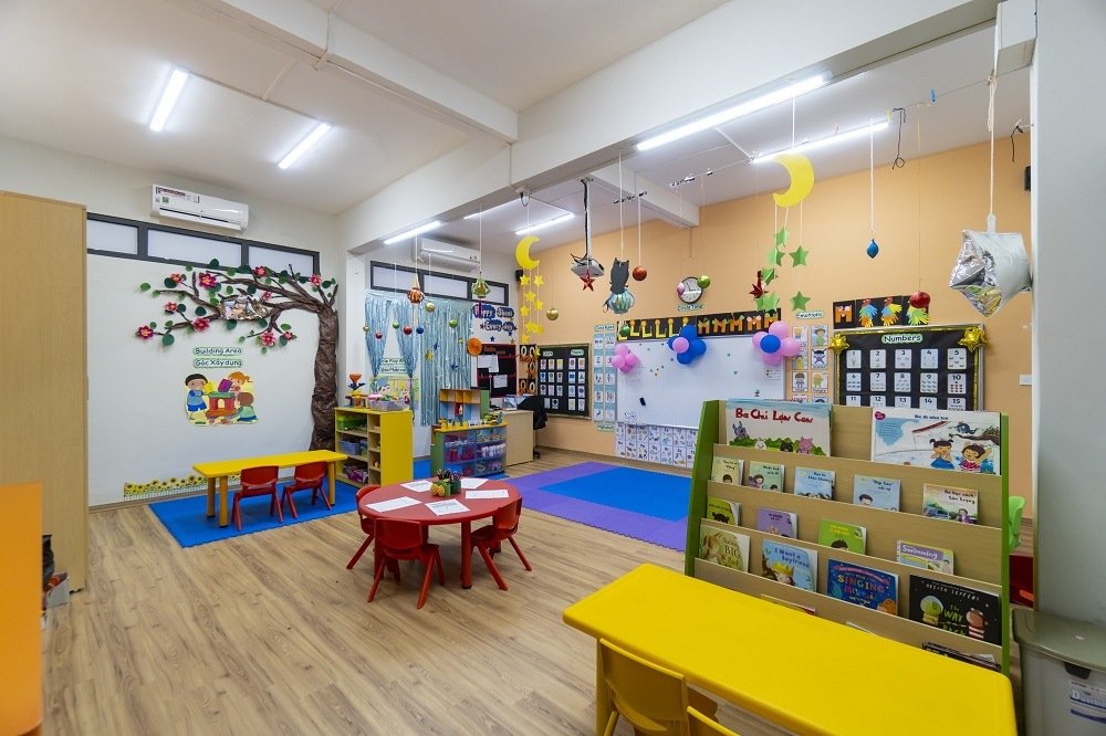 Cơ sở vật chất đầy đủ các phòng học, khu vui chơi, thư viện và phòng máy tính